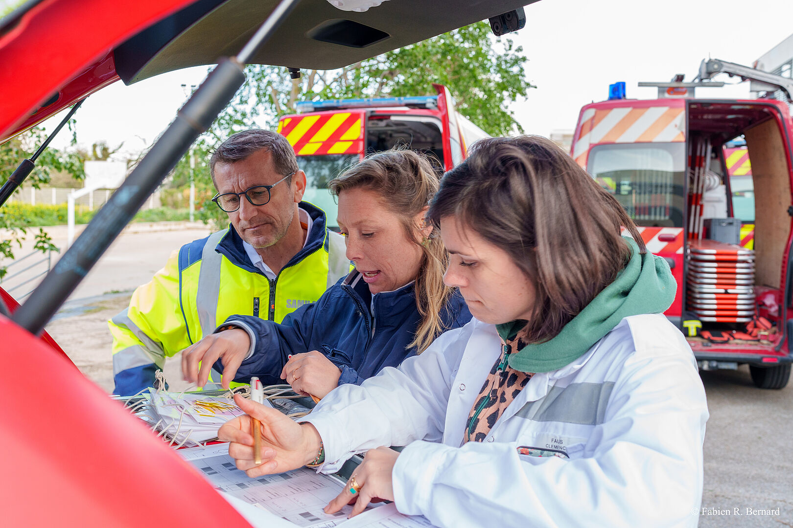 Les équipes du SAMU ont procédé à l'ouverture de la salle de crise au CRRA 15 dès la réception de la première alerte, permettant d'assurer une communication interservices efficace. Les procédures spécifiques de gestion de crise en cas de risque NRBC-E ont été appliquées avec comme principaux objectifs d'assurer la protection des personnels engagés, la protection des établissements de santé, la mobilisation des antidotes spécifiques et la mise en application des procédures d'organisation générale pour la gestion d'un afflux de nombreuses victimes au CHU. La mise en place des bracelets SINUS (système informatisé de dénombrement et de classification des victimes) par le SDIS, a permis de tester en temps réel les outils de régulation et de gestion de crise au SAMU (SI-SAMU, SI-VIC) pour la régulation et l'orientation des victimes fictives.