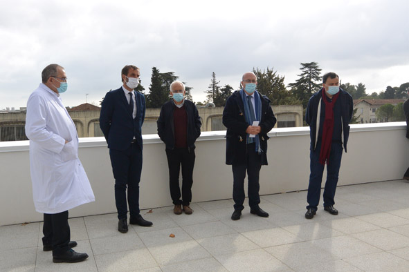 En attendant l’inauguration « officielle » après la crise sanitaire, une visite a eu lieu avant l’emménagement complet, le 21 janvier dernier en présence de Monsieur Michael Delafosse, Président du Conseil de Surveillance et Maire de Montpellier, M. Thomas Le Ludec, Directeur Général du CHU, le Pr Patrice Taourel, Président de la CME, le Pr Vincent LE Moing, Chef du Pôle des Cliniques Médicales, le Pr Jacques Reynes, Responsable du Département des Maladies Infectieuses et Tropicales ainsi qu’une petite partie de l’équipe.